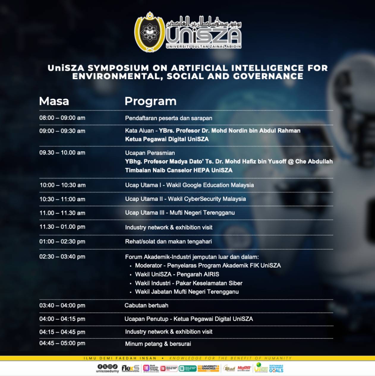 Program ini akan berlangsung di Universiti Sultan Zainal Abidin (UniSZA), Kampus Gong Badak. Peserta boleh merujuk tentatif melalui tab di bawah.